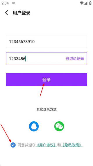 4、勾選同意用戶協(xié)議和隱私政策,點(diǎn)擊登錄按鈕,完成賬號(hào)登錄操作。