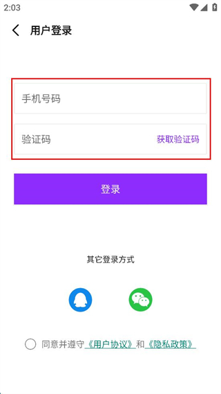 3、在用戶登錄界面,輸入手機(jī)號(hào)碼和驗(yàn)證碼。