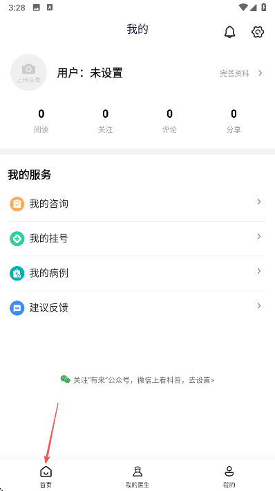 1、打開(kāi)有來(lái)醫(yī)生APP,在底部菜單欄點(diǎn)擊首頁(yè),進(jìn)入首頁(yè)界面。