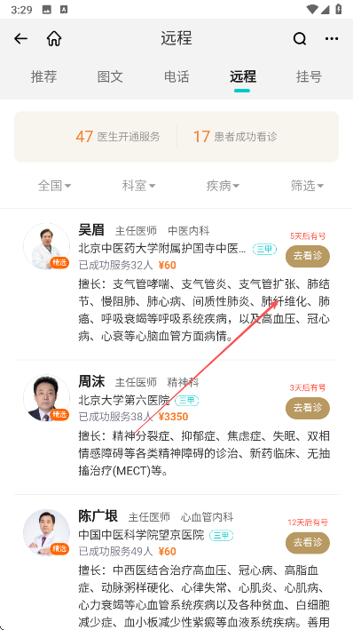 3、在遠(yuǎn)程看診頁(yè)面,瀏覽醫(yī)生列表,選擇合適的醫(yī)生,點(diǎn)擊醫(yī)生右側(cè)的去看診按鈕。