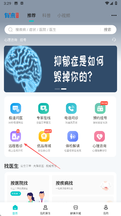 2、在首頁(yè)界面中,找到并點(diǎn)擊遠(yuǎn)程看診圖標(biāo),進(jìn)入遠(yuǎn)程看診頁(yè)面。