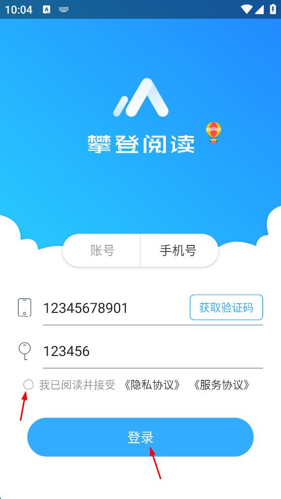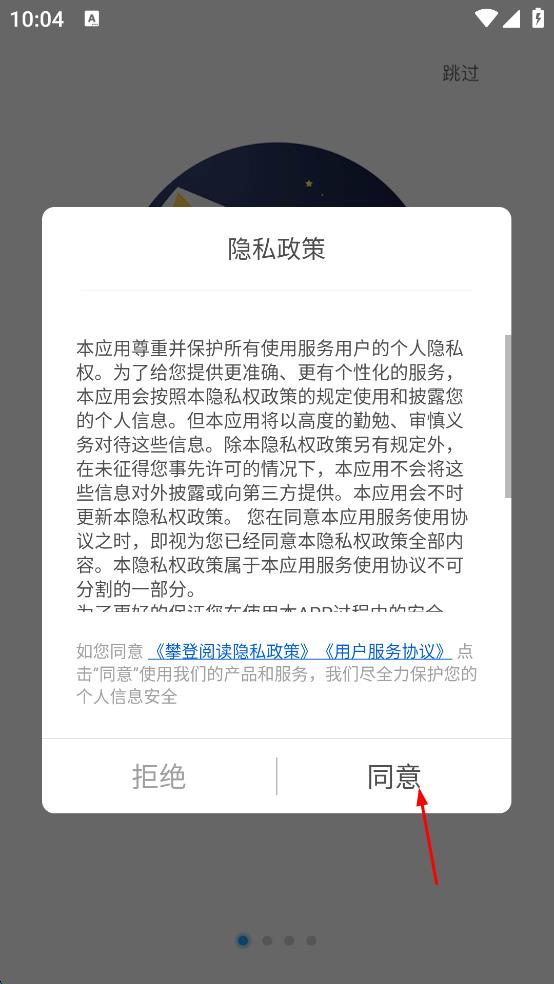 1、打開攀登閱讀APP,彈出“隱私政策”窗口,仔細閱讀內(nèi)容后,點擊“同意”按鈕,進入登錄界面。