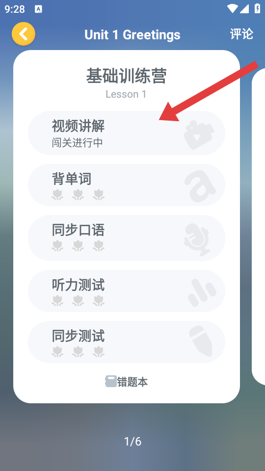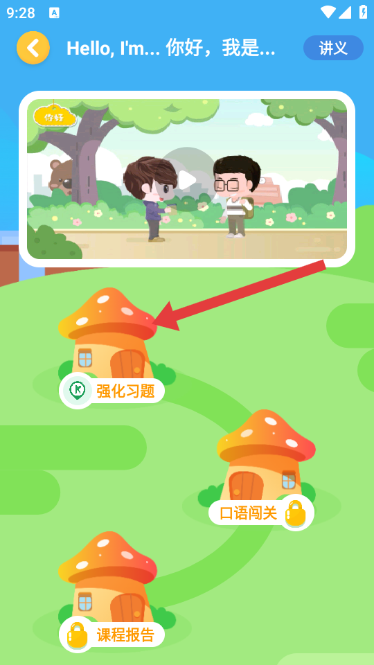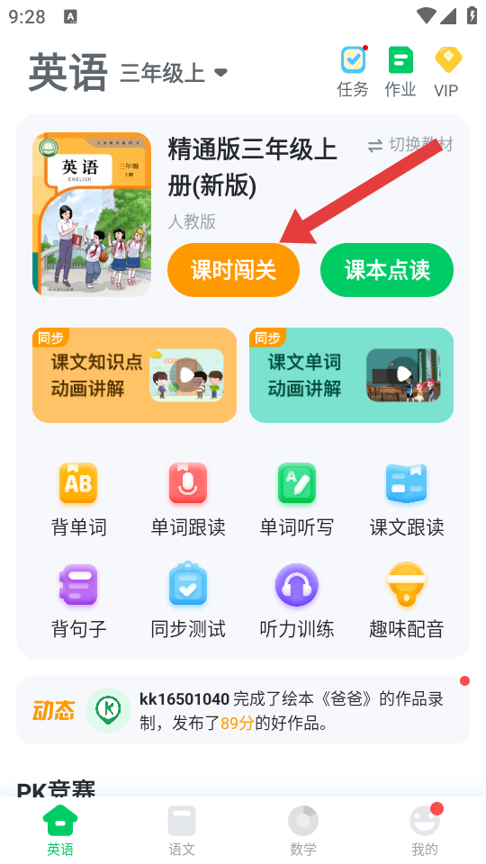 1、打開可可寶貝APP,在英語學習頁面點擊課時闖關,進入課時闖關界面。