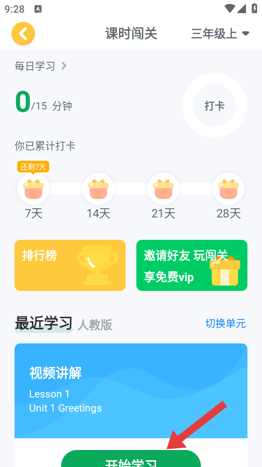 2、在課時闖關界面,需要學習15分鐘才能打卡,我們點擊開始學習。
