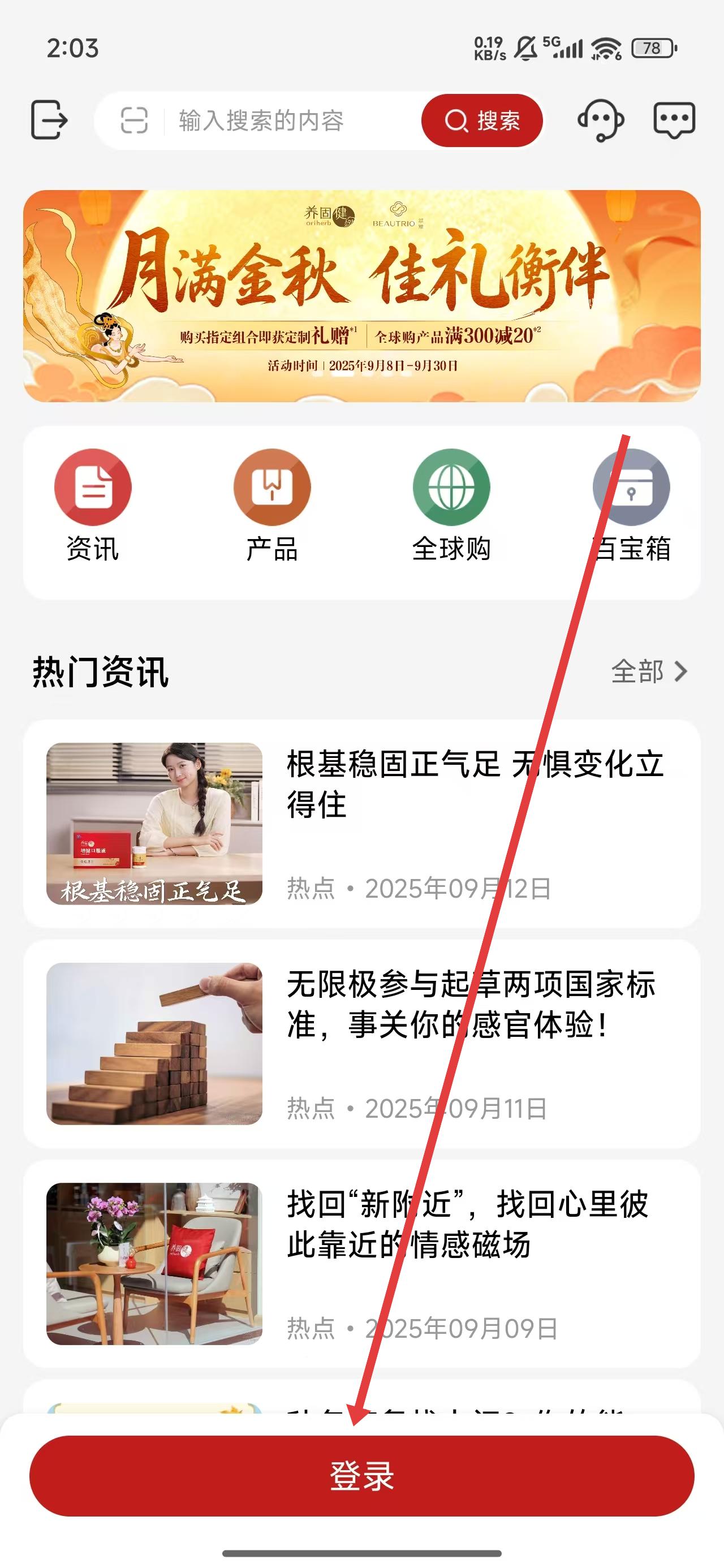 1、進(jìn)入到無限極首頁中,點(diǎn)擊底部登錄按鈕,準(zhǔn)備開始登錄操作。