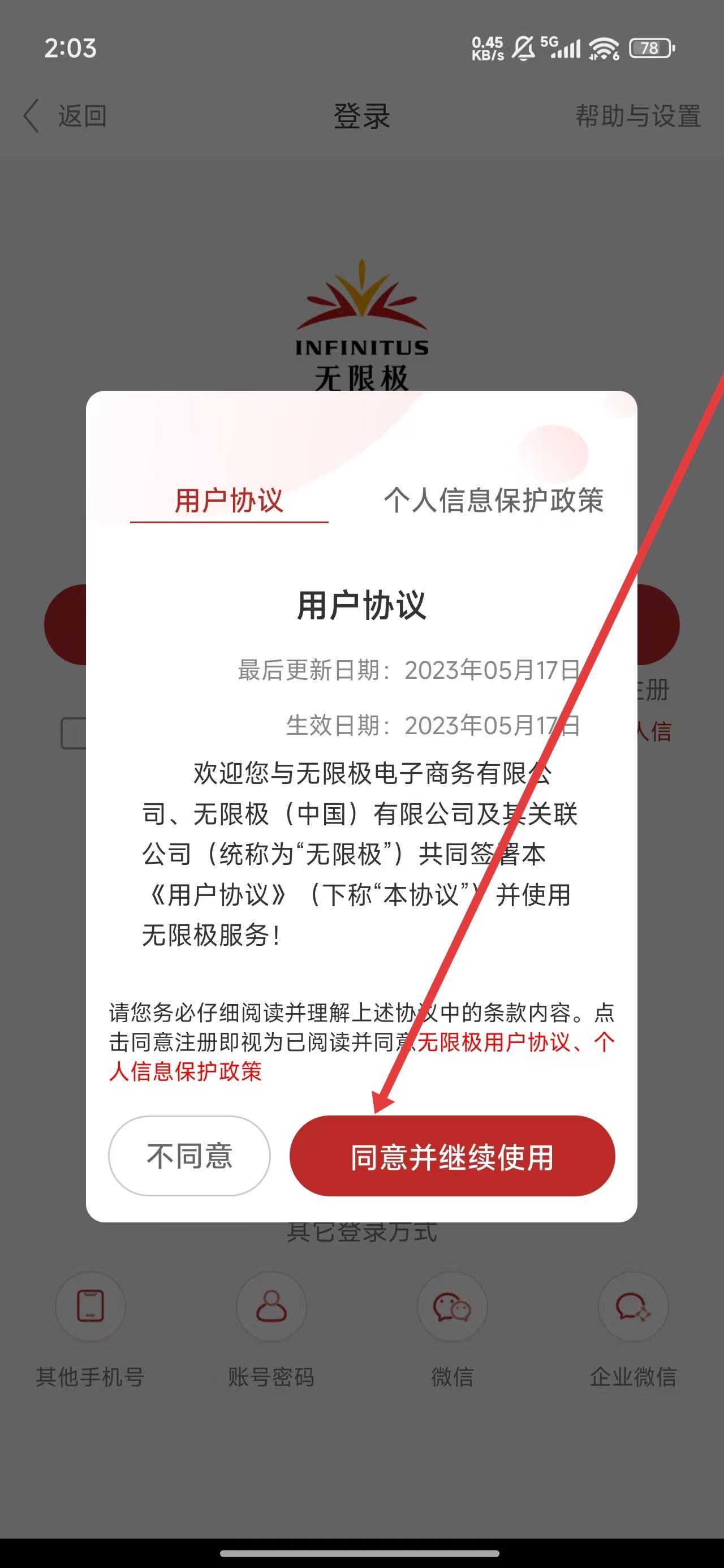 3、可以通過點(diǎn)擊彈窗中的同意并繼續(xù)使用按鈕,開始注冊操作。