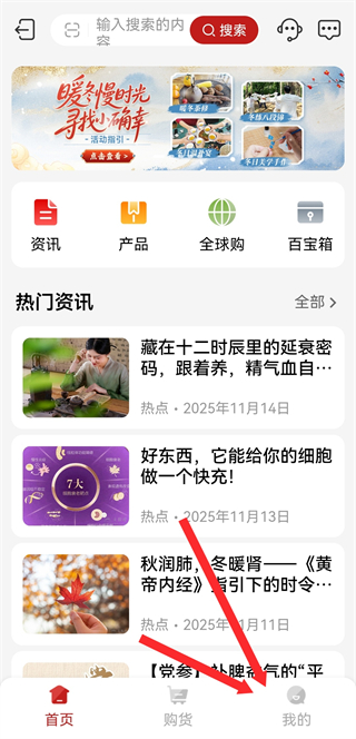 1、在無限極的首頁,點(diǎn)擊底部我的按鈕,進(jìn)入個人頁面。