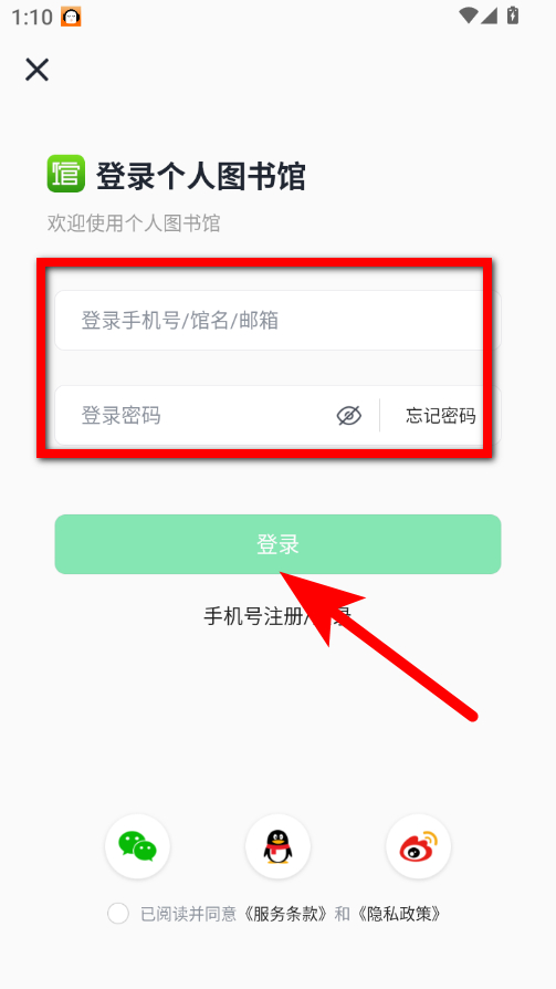 3、在密碼登錄界面,輸入登錄手機號/館名/郵箱和登錄密碼即可。