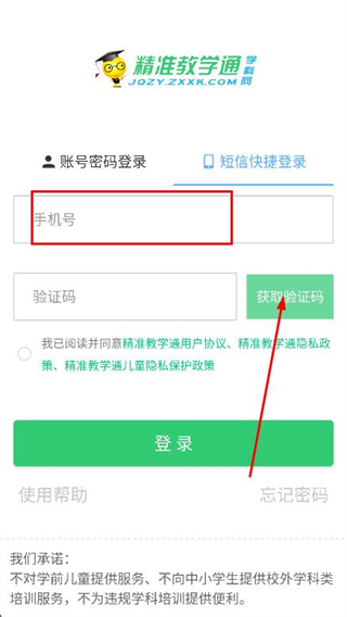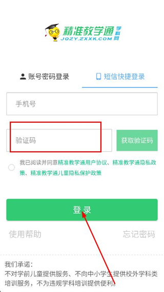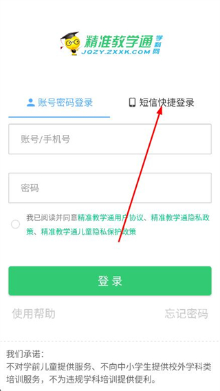 1、打開(kāi)精準(zhǔn)教學(xué)通APP,在登錄頁(yè)面點(diǎn)擊短信快捷登錄。