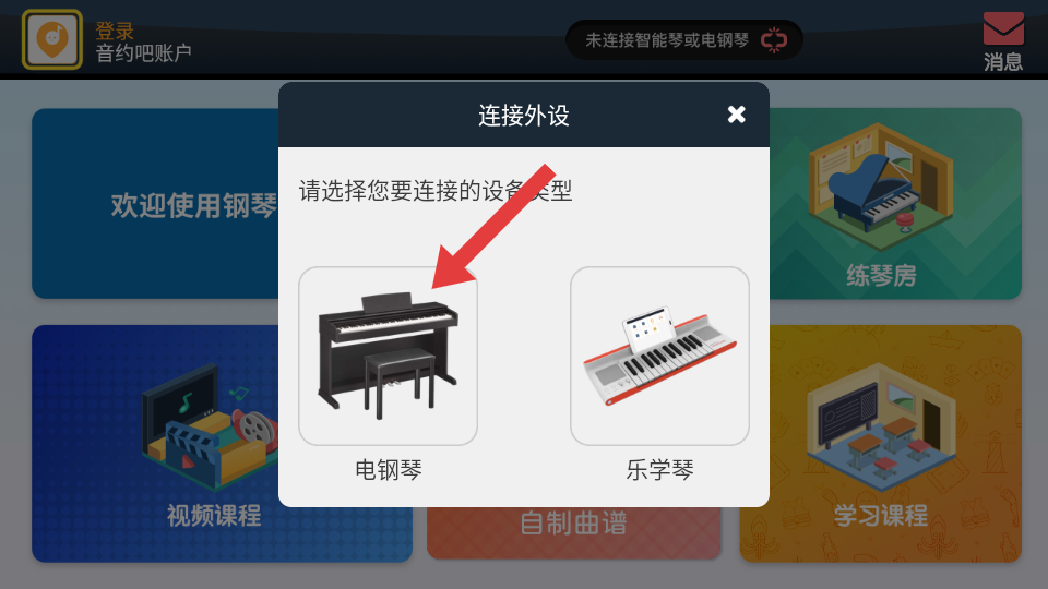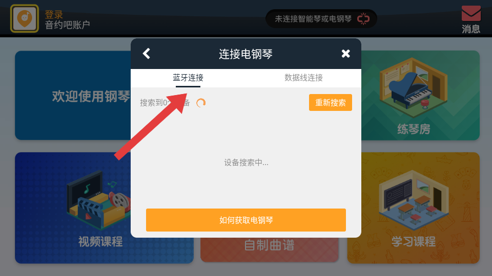 1、在鋼琴教練主界面,點擊頂部未連接智能琴或電鋼琴提示區(qū)域,觸發(fā)外設(shè)連接流程。