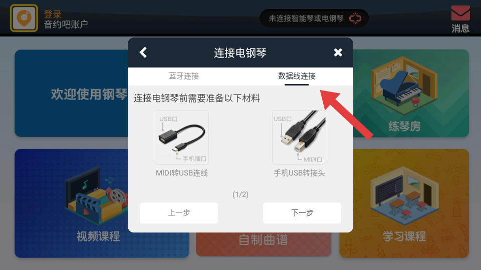 4、若選擇數(shù)據(jù)線連接,需準(zhǔn)備MIDI轉(zhuǎn)USB連線等,按提示通過線材連接。