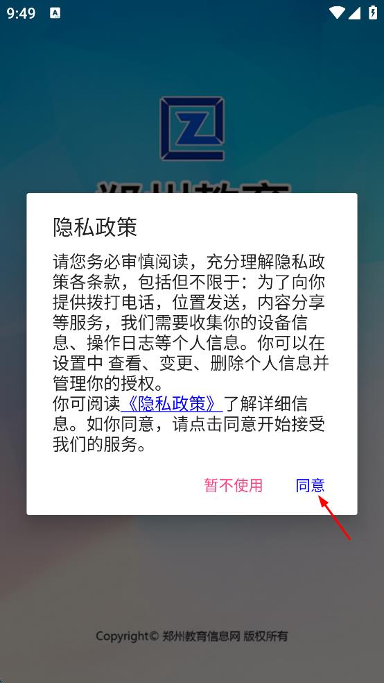 1、打開鄭州教育信息網APP,彈出隱私政策提示框,認真閱讀后,點擊“同意”,進入APP首頁。