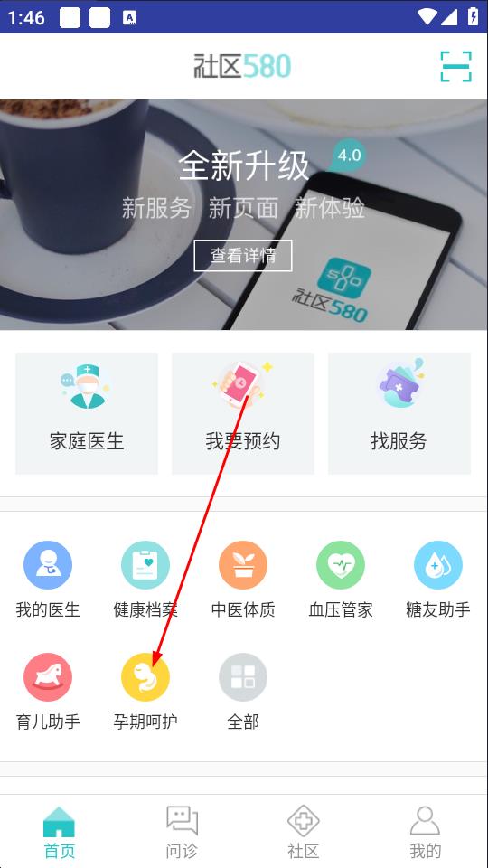 1、打開社區(qū)580APP,在首頁中找到并點擊孕期呵護(hù)圖標(biāo)。