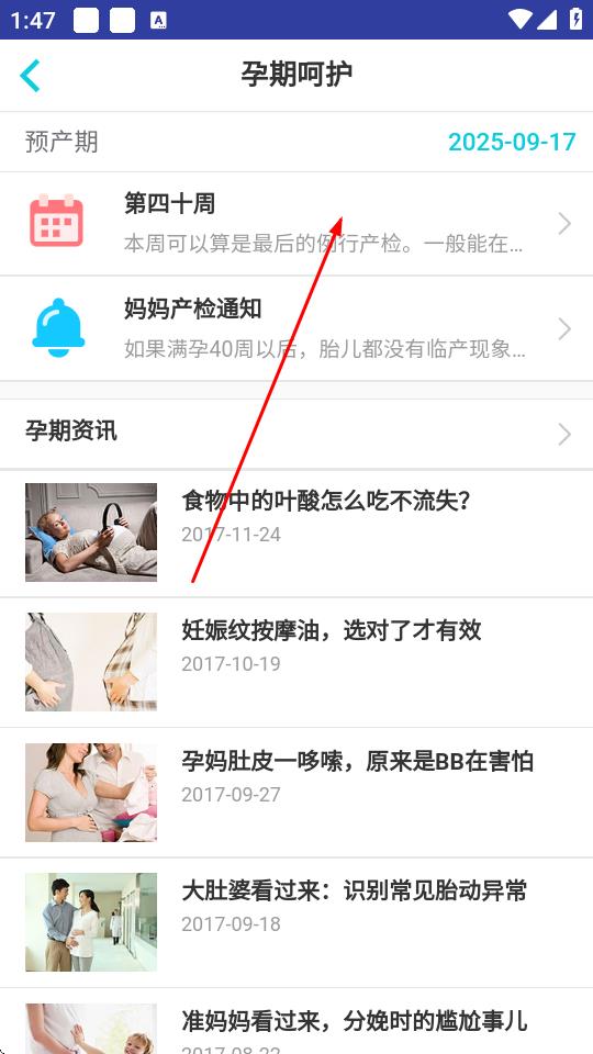 2、進(jìn)入孕期呵護(hù)頁面后,可以看到預(yù)產(chǎn)期信息以及本周的孕期提示,還能看到孕期資訊標(biāo)題列表,可點擊懷孕的周數(shù)。