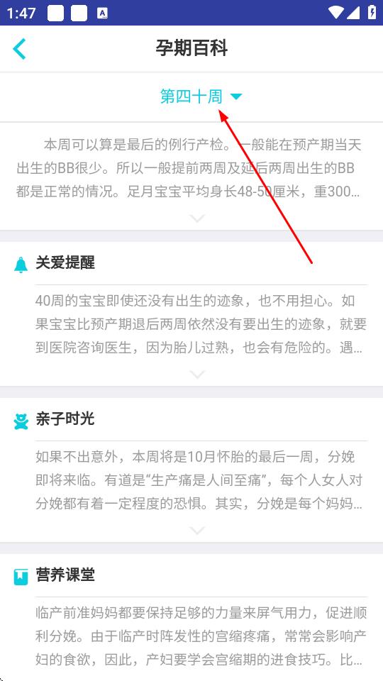 3、如果要查看孕期的其他周數(shù),點擊頂部顯示的孕周。