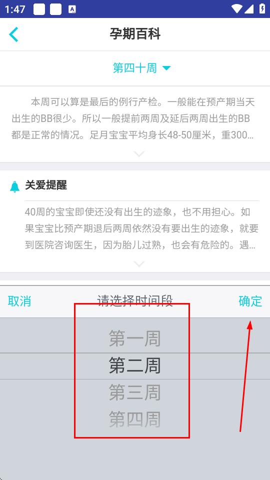 4、在彈出的孕周選擇框中,選擇想要了解的孕周,點擊確定。