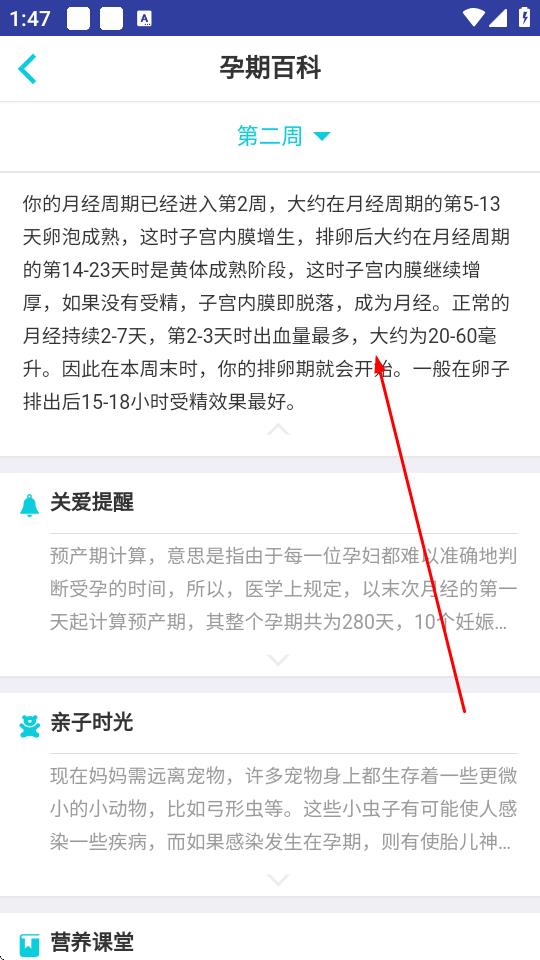 5、頁面會顯示對應(yīng)孕周的孕期百科內(nèi)容、關(guān)愛提醒、親子時光、營養(yǎng)課堂等孕期資訊。