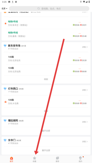 1、點(diǎn)擊界面底部收藏圖標(biāo),進(jìn)入收藏管理頁(yè)面,可查看已收藏的公交或地鐵路線信息。