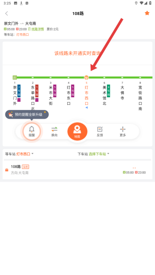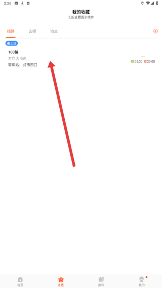 2、在收藏頁(yè)面選中已收藏的線路如108路,進(jìn)入線路詳情頁(yè),查看站點(diǎn)分布、運(yùn)營(yíng)時(shí)間等信息。