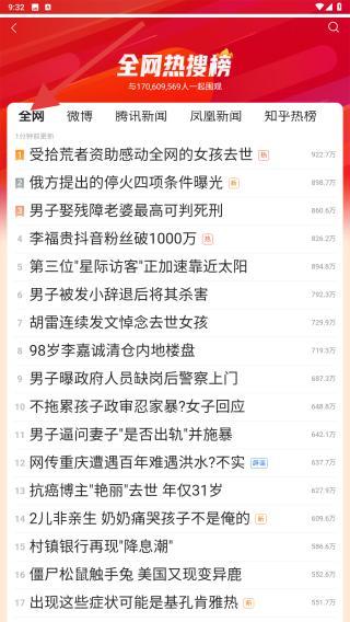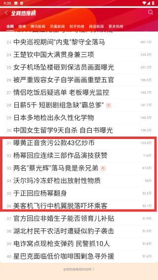2、進入完整榜單頁,點擊全網(wǎng)的內容話題,向下滑動進行瀏覽全量熱搜及話題詳情。