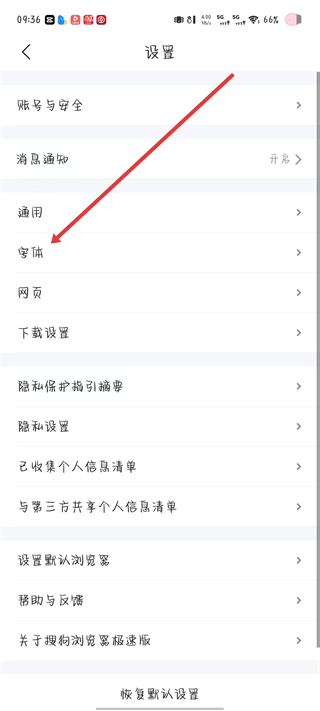 3、在設置界面里,選擇字體選項,進入字體相關的設置頁面。