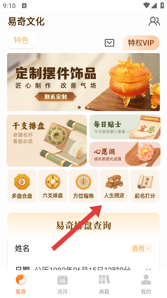 1、打開易奇八字軟件,找到人生順逆運勢查詢功能并點擊,進入運勢查詢的界面。