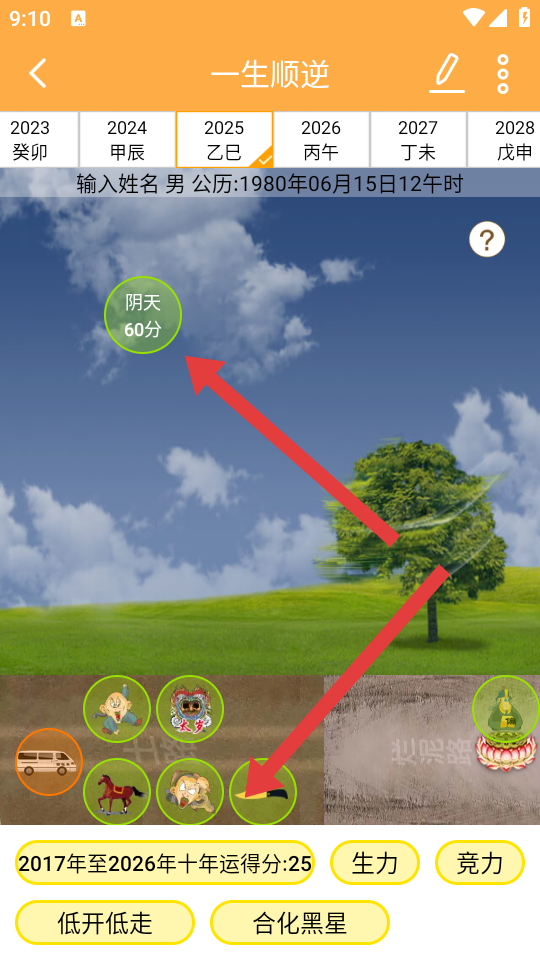 2、選擇要查看的年份,輸入姓名、出生的年、月、日、時等信息,獲取對應年份的運勢概括,還可以點擊天象評分。