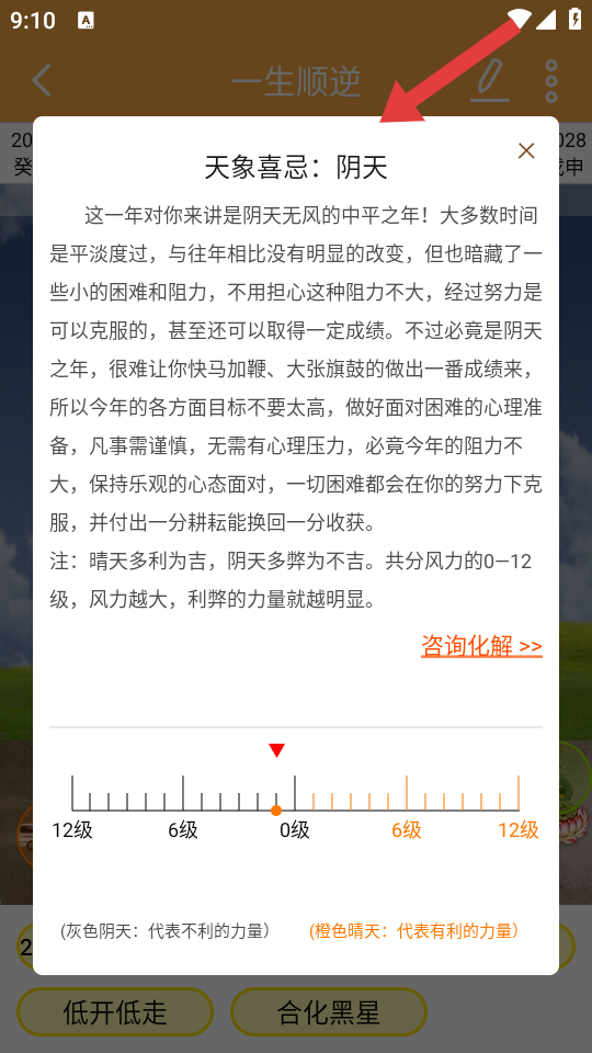 3、點擊天象評分的區(qū)域,查看詳細的天象喜忌解讀,了解該年運勢特點,從而知曉事業(yè)、生活等方面的運勢走向。
