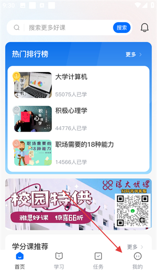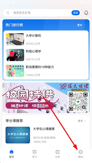 1、打開優(yōu)課APP,在首頁(yè)點(diǎn)擊右下角我的,進(jìn)入個(gè)人頁(yè)面。