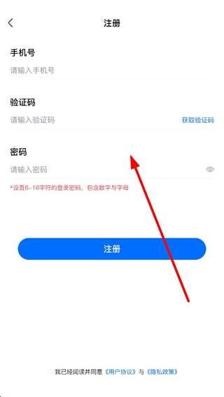 3、在注冊(cè)頁(yè)面輸入手機(jī)號(hào)、驗(yàn)證碼,設(shè)置密碼,勾選同意相關(guān)協(xié)議后,點(diǎn)擊注冊(cè)按鈕完成注冊(cè)。