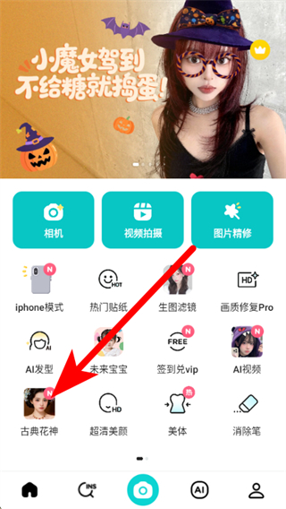 1、打開b612咔嘰APP,選擇古典花神等特效入口,進入特效選擇頁面。