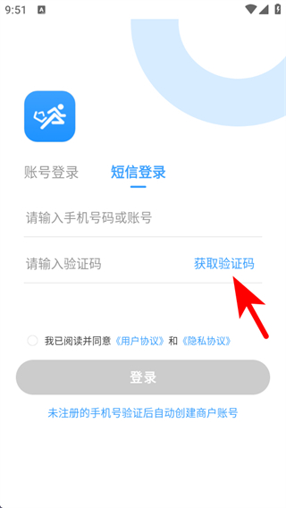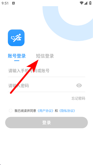 1、打開快跑者,點擊短信登錄,切換至短信登錄界面。
