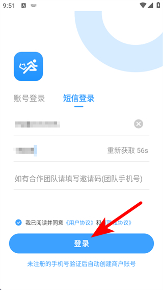 3、輸入驗證碼并勾選協(xié)議后點擊登錄,完成快跑者賬號注冊操作。