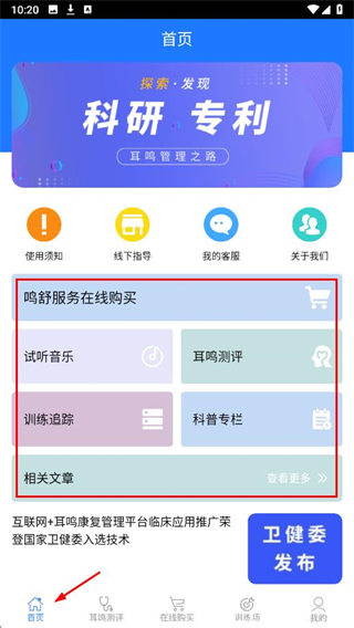 5、首頁有鳴舒服務(wù)在線購買、試聽音樂、科普專欄、相關(guān)文章等板塊,還有使用須知、線下指導(dǎo)、我的客服、關(guān)于我們等功能入口。