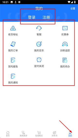 4、用戶可進(jìn)行登錄注冊,管理收貨地址、客服咨詢、優(yōu)惠券使用,查看我的訂單、我的音樂、訓(xùn)練追蹤、耳鳴報告、定時關(guān)閉設(shè)置、我的待辦和我的通知等。