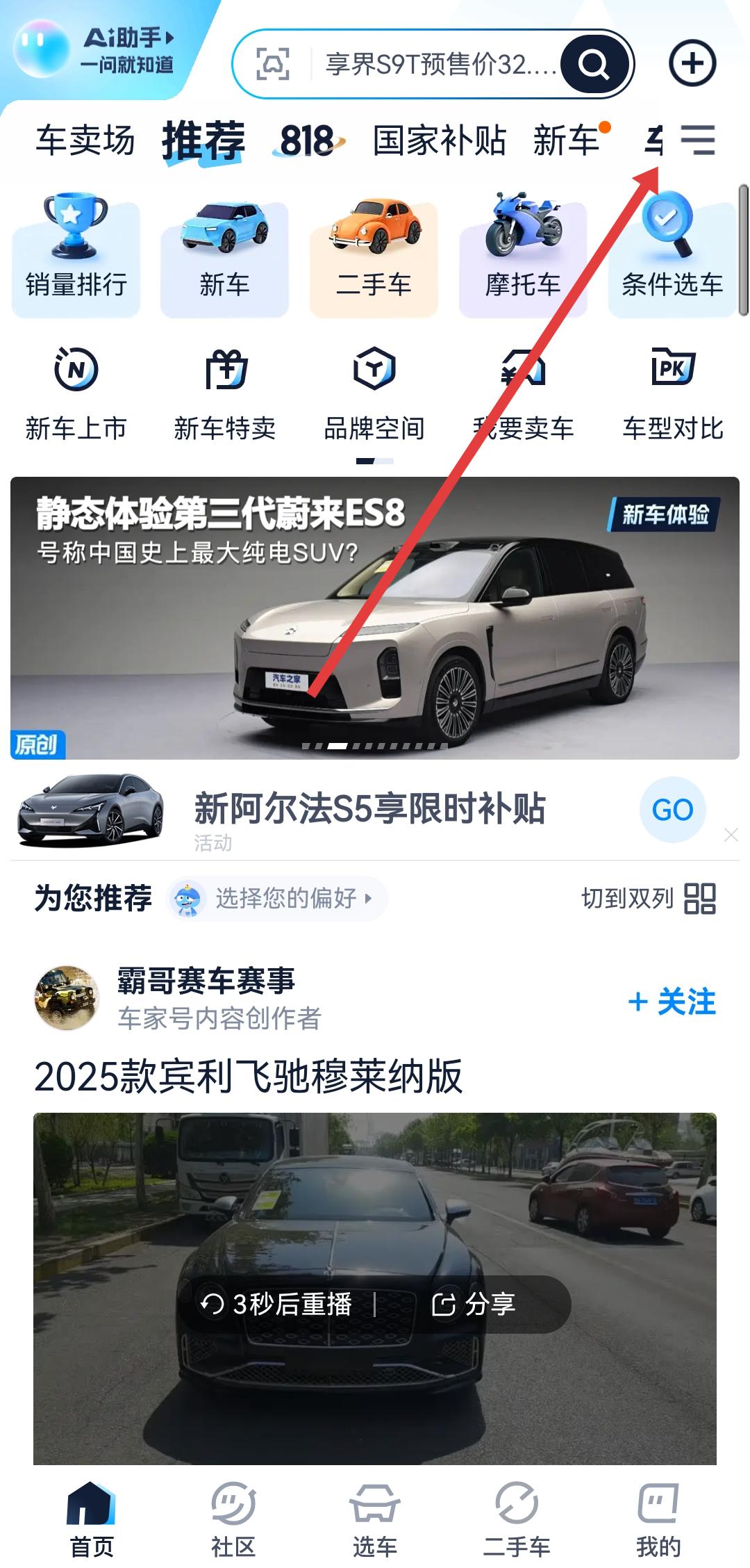 1、在汽車之家的首頁后,需要點(diǎn)擊右上角三條橫線的更多圖標(biāo),然后進(jìn)入導(dǎo)航欄編輯的界面。