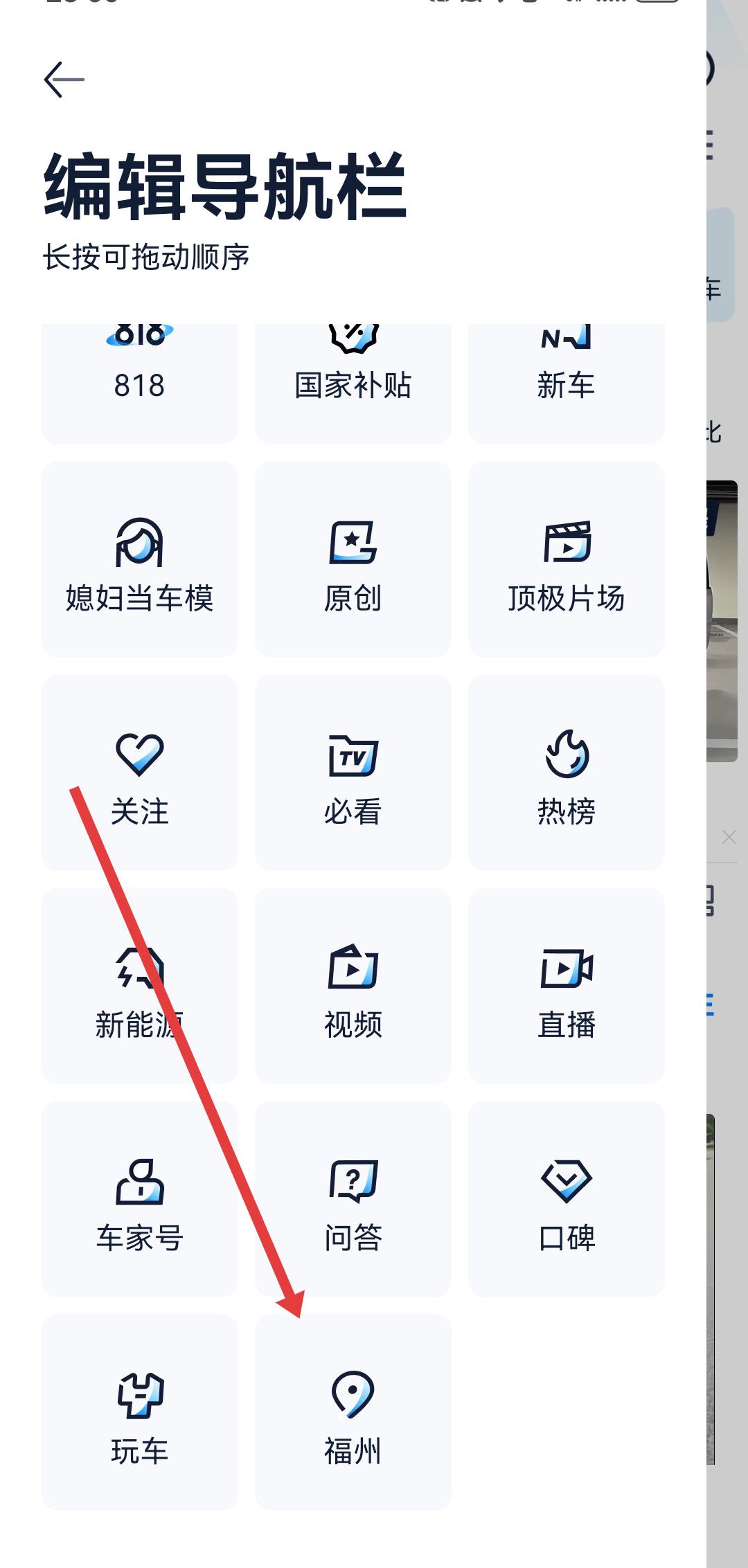 2、進(jìn)入到編輯導(dǎo)航欄的頁面中,需要找到帶有定位圖標(biāo)的城市選項(xiàng)如福州,點(diǎn)擊這個(gè)選項(xiàng)。