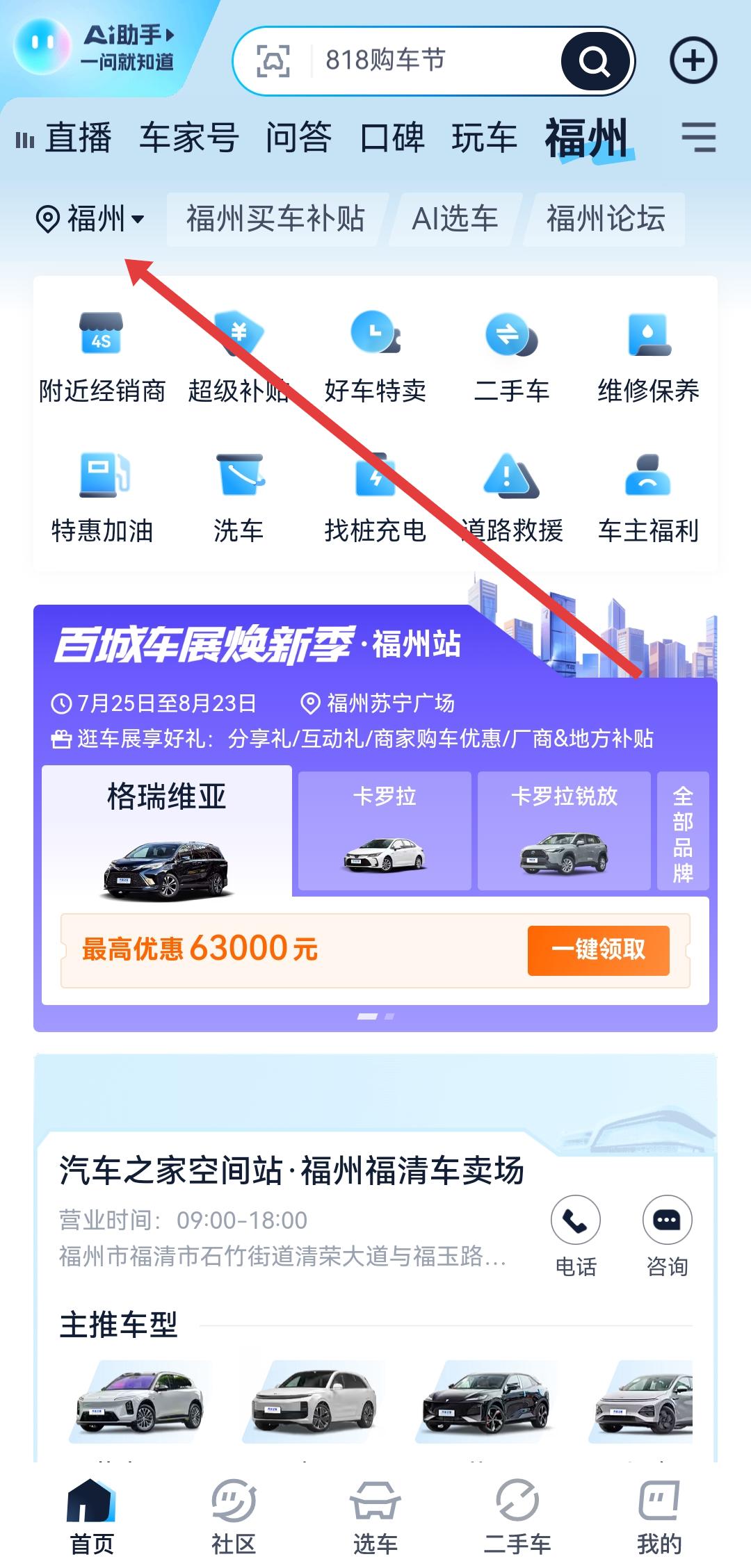 3、進(jìn)入城市選擇頁面后,點(diǎn)擊當(dāng)前顯示的城市名稱如福州,即可在彈出的城市列表中選擇目標(biāo)城市。