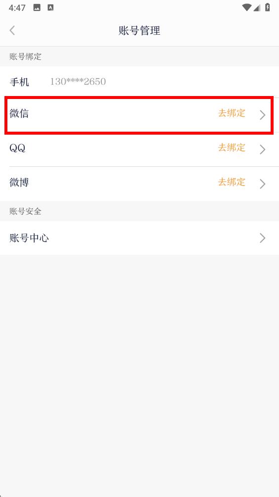 4、在賬號管理頁面中找到微信選項,點擊右側(cè)的去綁定按鈕,按照后續(xù)提示完成微信授權(quán)等操作即可成功綁定微信。