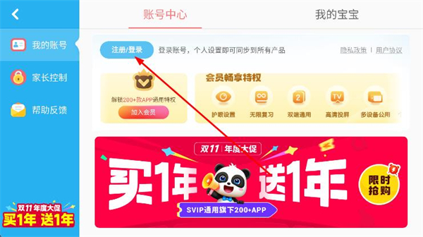 2、在賬號中心頁面,點擊注冊/登錄選項。