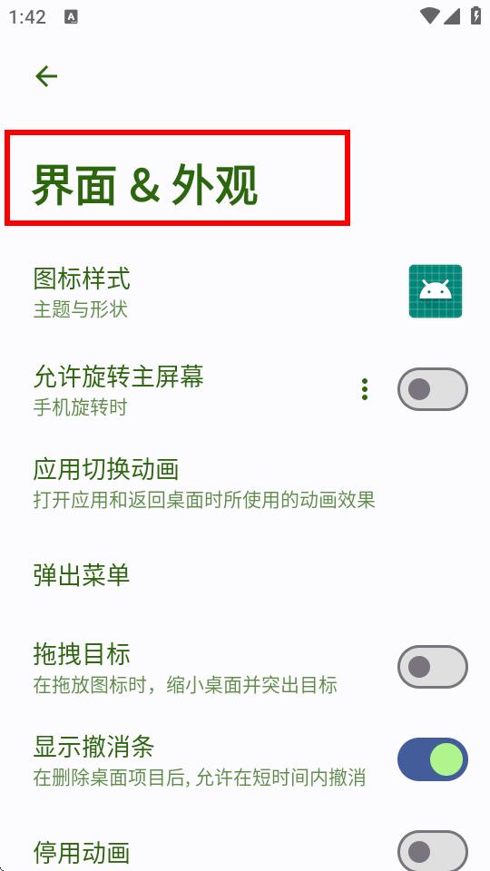 3、在界面&外觀設(shè)置頁(yè)面,可對(duì)圖標(biāo)樣式、應(yīng)用切換動(dòng)畫(huà)等進(jìn)行設(shè)置,打造個(gè)性化界面。