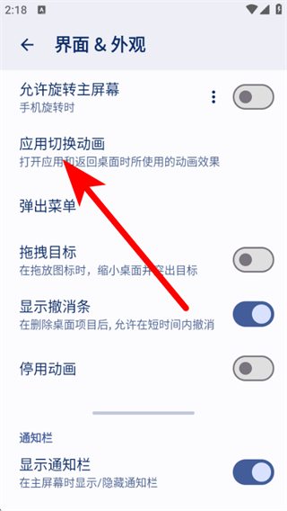 2、在界面&外觀設(shè)置頁(yè)面,點(diǎn)擊應(yīng)用切換動(dòng)畫(huà)選項(xiàng),彈出應(yīng)用切換動(dòng)畫(huà)列表。