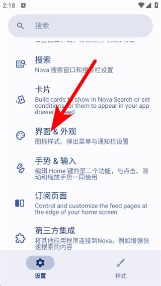 1、進(jìn)入Nova設(shè)置頁(yè)面,點(diǎn)擊界面&外觀選項(xiàng),進(jìn)入界面&外觀設(shè)置頁(yè)面。