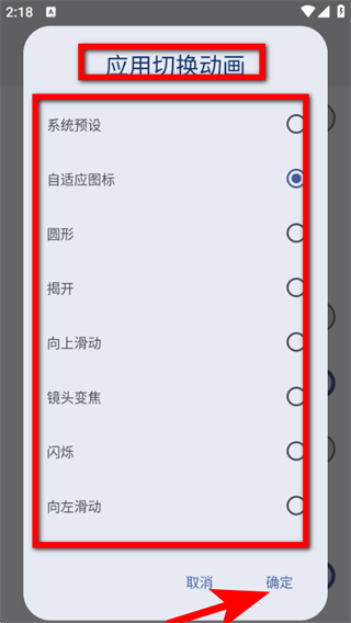 3、在應(yīng)用切換動(dòng)畫(huà)列表中,可選擇喜歡的效果,點(diǎn)擊確定按鈕,即可完成應(yīng)用切換動(dòng)畫(huà)效果的設(shè)置。