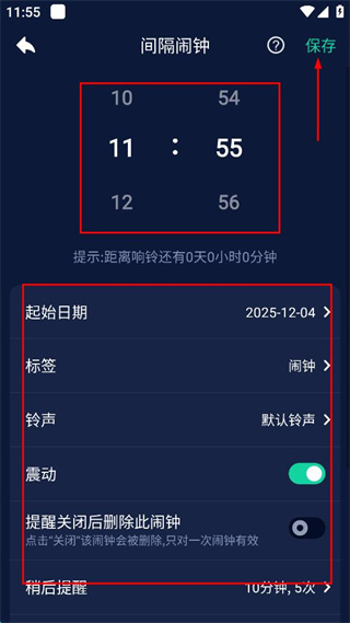 3、在間隔鬧鐘設(shè)置頁面調(diào)整時間,設(shè)置起始日期等相關(guān)選項后點擊保存。
