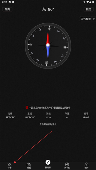 1、打開(kāi)地圖指南針APP,進(jìn)入首頁(yè)點(diǎn)擊左下角計(jì)步的圖標(biāo)。