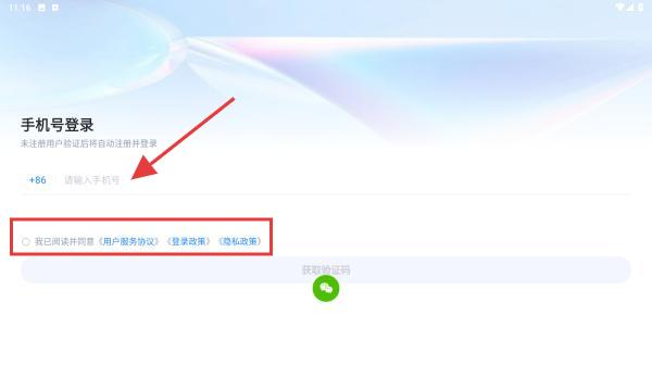 1、輸入手機號碼,勾選用戶協(xié)議,如用戶服務(wù)協(xié)議、隱私政策,再獲取驗證碼。
