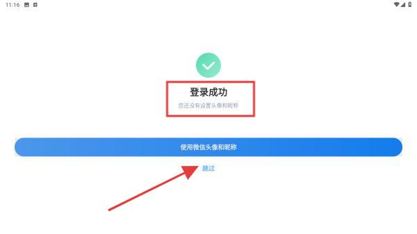 3、畫面顯示登錄成功表示已注冊成功,用戶可以使用微信頭像與昵稱也可點擊跳過自己設(shè)置。