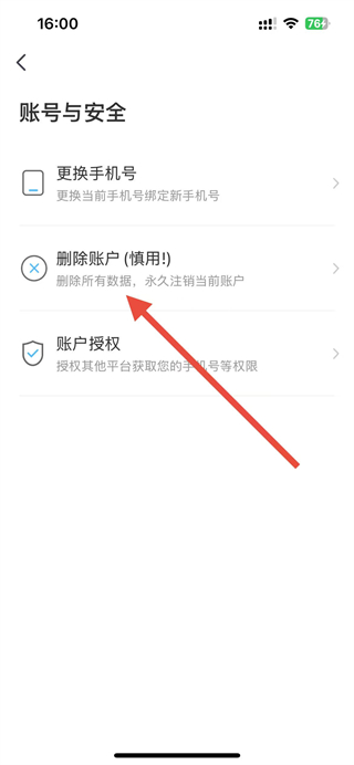 3、在賬號與安全頁面點擊刪除賬戶選項,進(jìn)入注銷賬戶頁面。