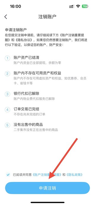 4、在注銷賬戶頁面勾選同意相關(guān)協(xié)議后,點擊申請注銷按鈕,即可完成賬戶注銷操作。